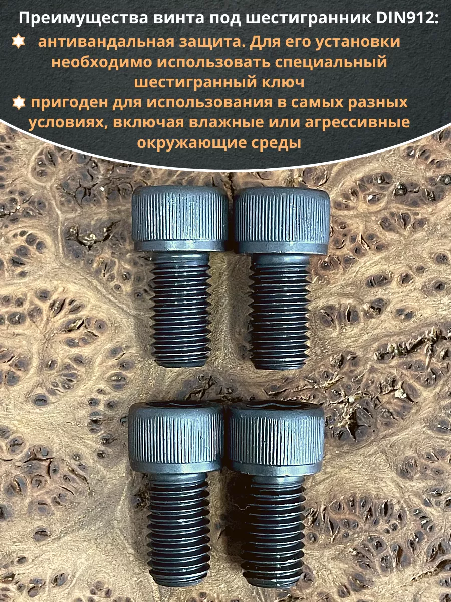 Винт имеет высокую цилиндрическую головку, предназначен для установки его с углублением в отверстие. Закручивается винт при помощи ключа-шестигранника. Высокопрочный винт DIN 912 обеспечивает надежное скрепление узлов и деталей в монтажных и других видах работ. Он имеет головку цилиндрической формы с углублением под соответствующий шестигранный ключ.