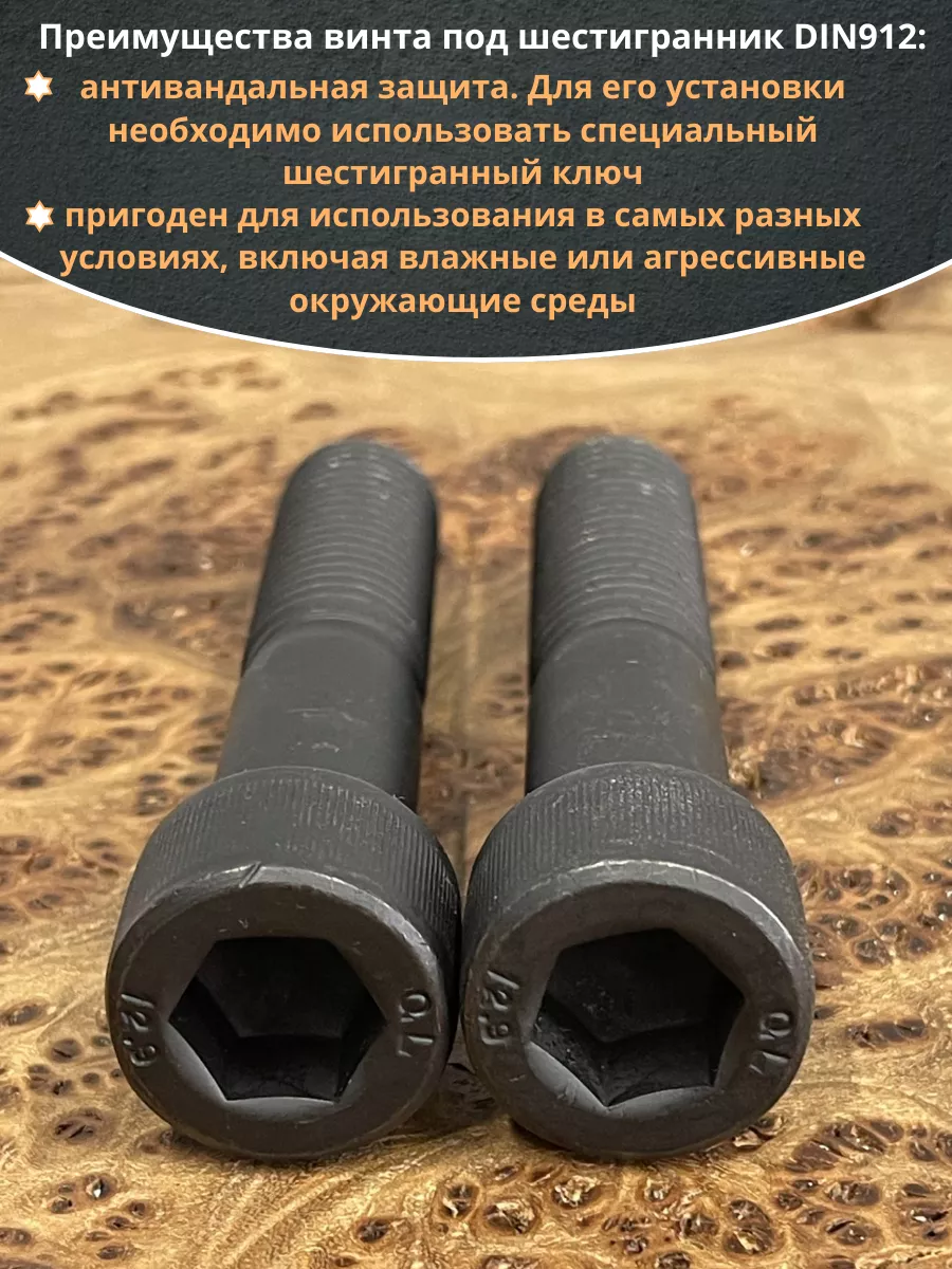 Винт имеет высокую цилиндрическую головку, предназначен для установки его с углублением в отверстие. Закручивается винт при помощи ключа-шестигранника. Высокопрочный винт DIN 912 обеспечивает надежное скрепление узлов и деталей в монтажных и других видах работ. Он имеет головку цилиндрической формы с углублением под соответствующий шестигранный ключ.