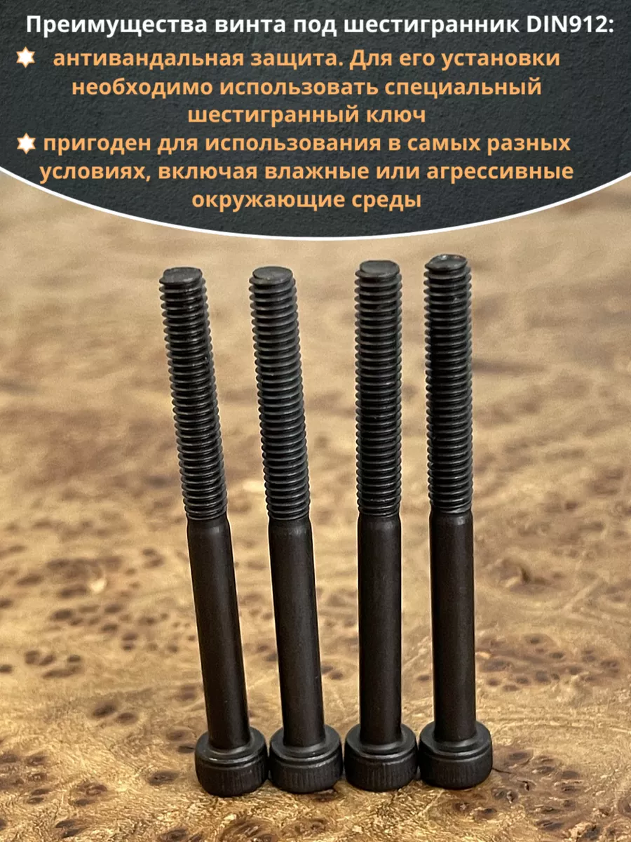 Винт имеет высокую цилиндрическую головку, предназначен для установки его с углублением в отверстие. Закручивается винт при помощи ключа-шестигранника. Высокопрочный винт DIN 912 обеспечивает надежное скрепление узлов и деталей в монтажных и других видах работ. Он имеет головку цилиндрической формы с углублением под соответствующий шестигранный ключ.