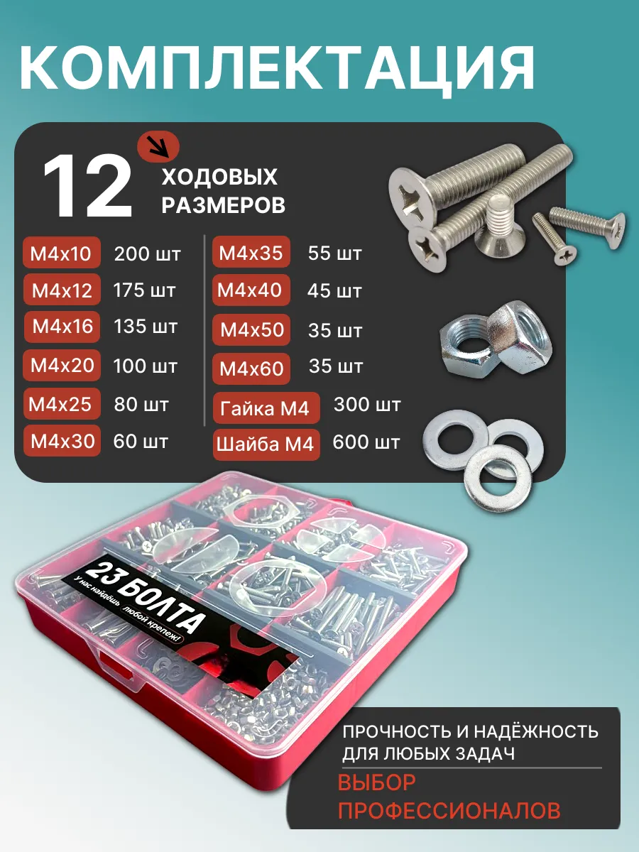 Винты нерж потай М4 DIN965 с гайкой,шайбой органайзер НАБОР4