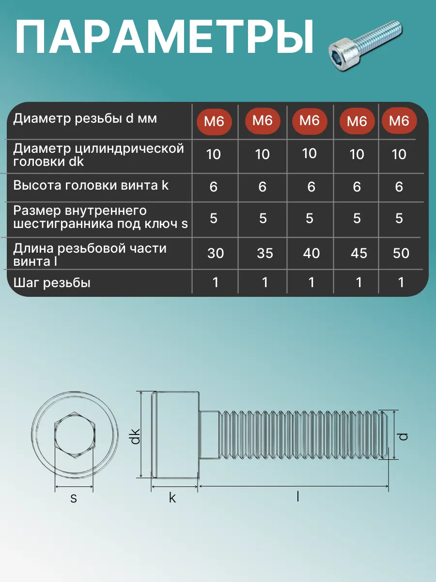 Винт с внут.шестигр. 6х50 мм класс прочности 8.8 DIN 912 полная резьба, оцинкованный - 20 шт